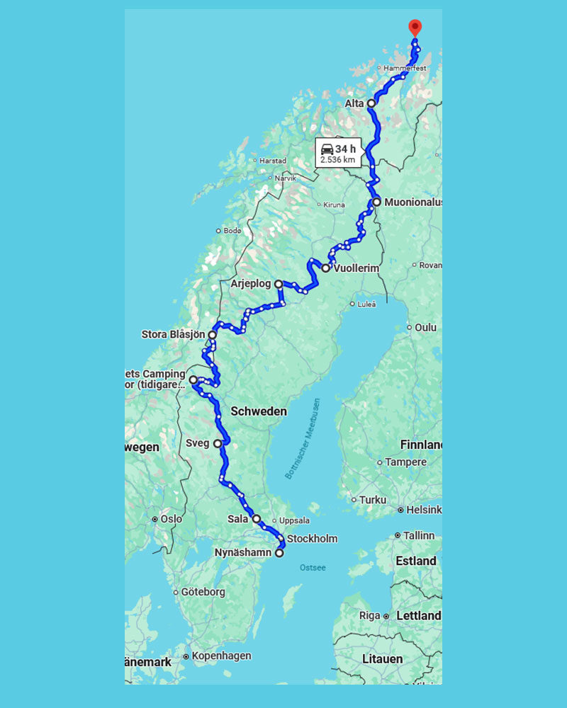 Wir sind nicht nach Süden, Osten oder Westen gefahren. Wir sind nach Norden aufgebrochen — von Berlin aus, weit nach Norden, nach Norwegen, zum Nordkapp. Zum nördlichsten Punkt Europas, den man mit dem Motorrad erreichen kann. Alles, was weiter nördlich liegt, braucht Schiffe oder Hundeschlitten.