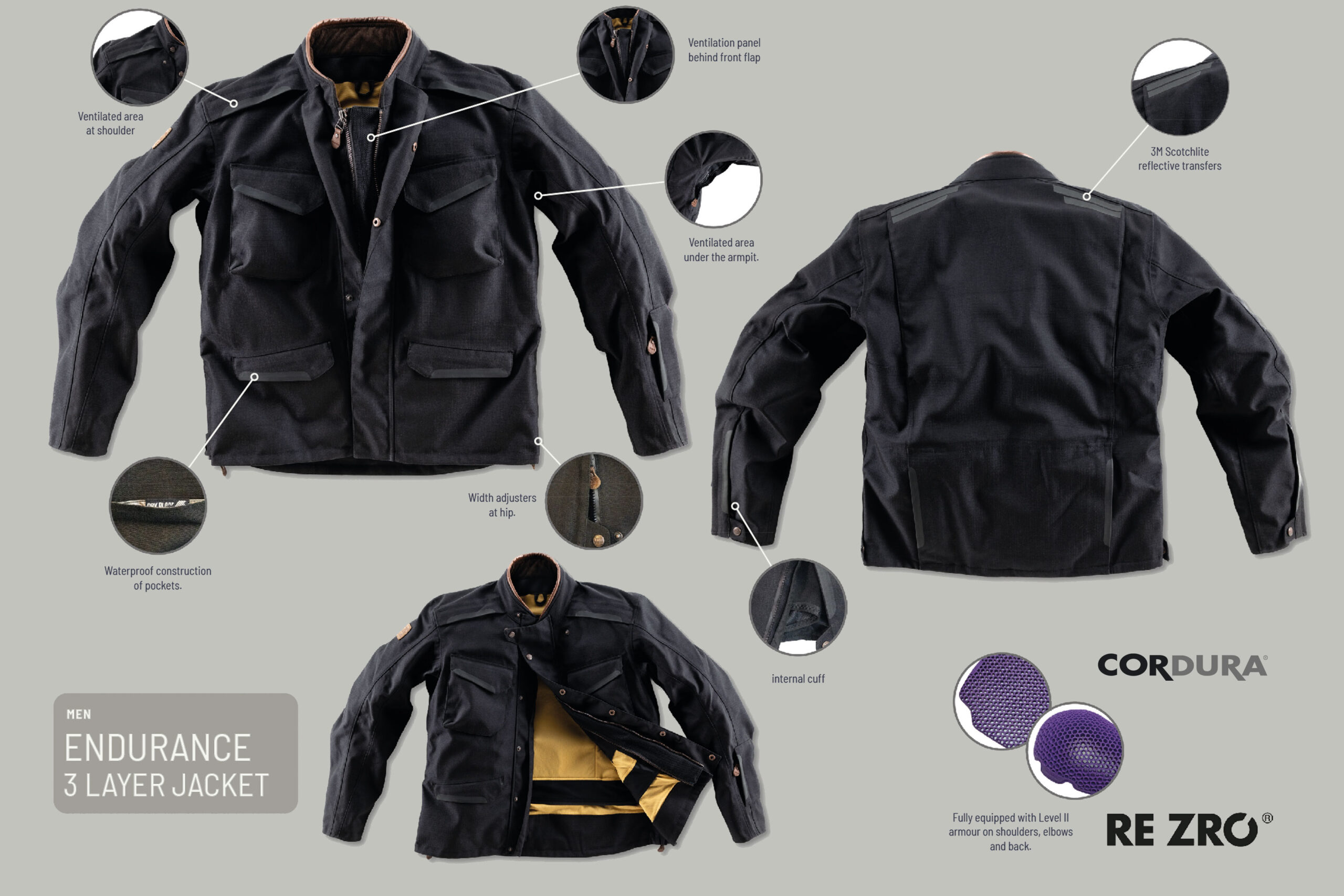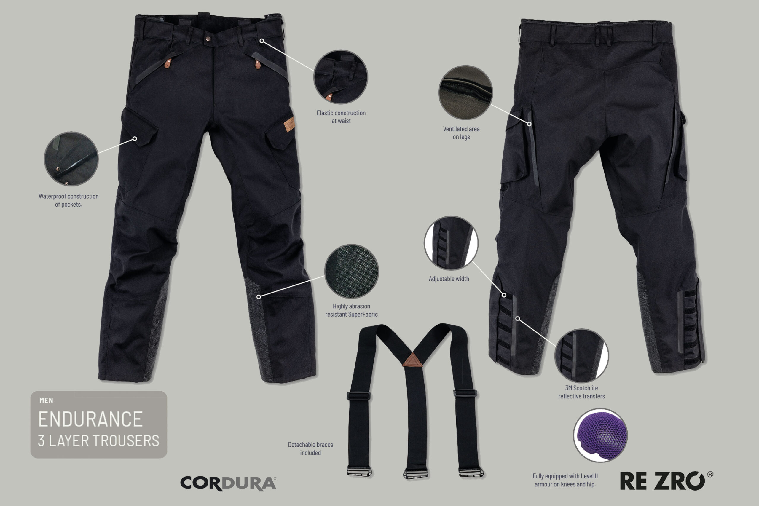 This suit is made from a abrasion resistent 3-layer Cordura ripstop fabric. Strategically placed and highly functional ventilation openings do not detract from the minimalist design.